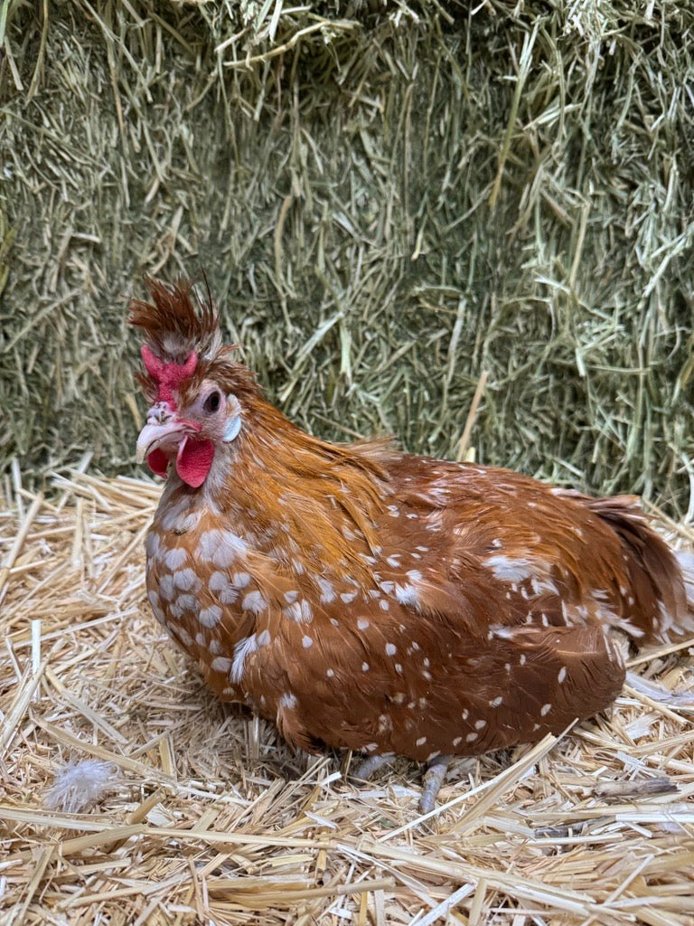 • Notable Characteristics: Like all Spitzhaubens, the Chamois variety has a forward-pointing crest of feathers resembling the traditional "spitzhauben" bonnet worn by women in Appenzell, Switzerland, paired with a V-shaped (horn) comb.